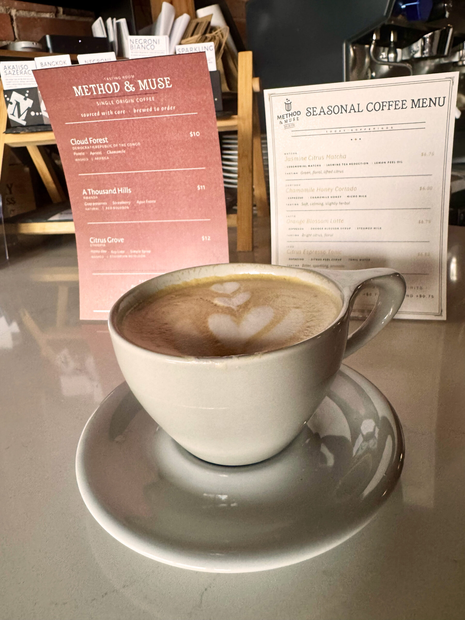- Cortado — Espresso & steamed milk, 1:1. $4.75
